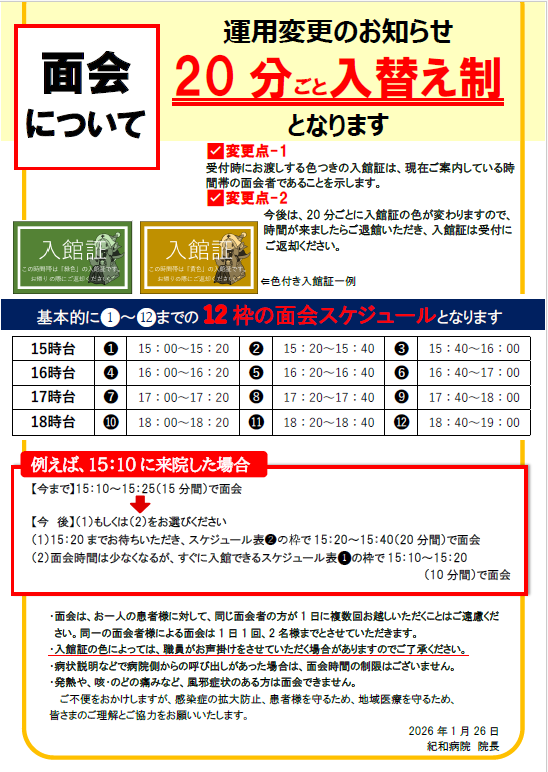 ・面会は、お一人の患者様に対して、同じ面会者の方が1日に複数回お越しいただくことはご遠慮ください。同一の面会者様による面会は1日1回、2名様までとさせていただきます。
